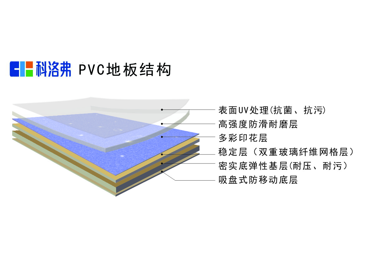 科洛弗PVC 塑膠地板主要材料為pvc(聚氯乙烯)樹脂,從結構上分主要有多層復合型和同質透心型及半同質體型3種。其中多層復合型PVC地板的意思是它有多層結構的,一般是由4-6層結構疊壓而成,具體為:耐磨層(含UV處理)、印花膜層、玻璃纖維層、 彈性發泡層、磨壓層、基層等。這些不同結構經過特殊處理,合而為一,使之具有很好的耐熱性、防潮性、質量穩定性、抗衰老、抗菌、靜音、耐磨、防火阻燃等優點。