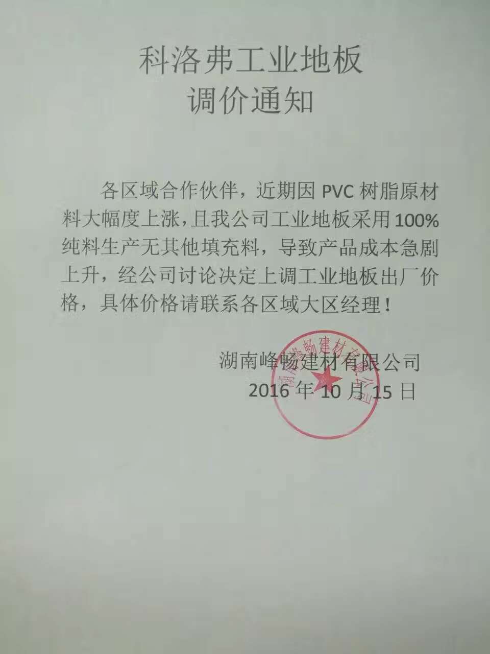 各區(qū)域合作伙伴,近期因PVC樹脂原材料大幅度上漲,且我公司工業(yè)地板采用100%純料生產(chǎn)無其他填充料,導(dǎo)致產(chǎn)品成本急劇上升,經(jīng)公司討論決定上調(diào)工業(yè)地板出廠價(jià)格,具體價(jià)格請(qǐng)聯(lián)系各區(qū)域大區(qū)經(jīng)理!